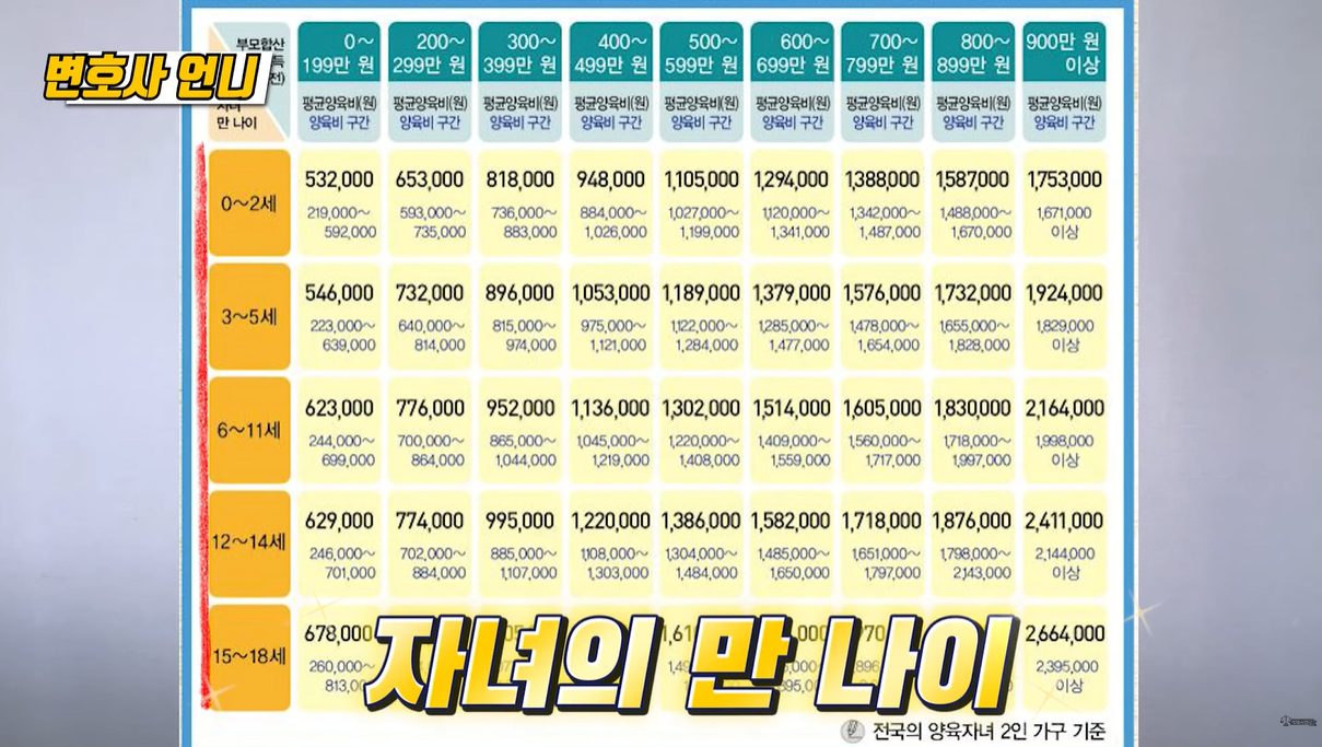 가정법원에서 제공하는 양육비 산정 기준표를 간단히 정리했습니다.
